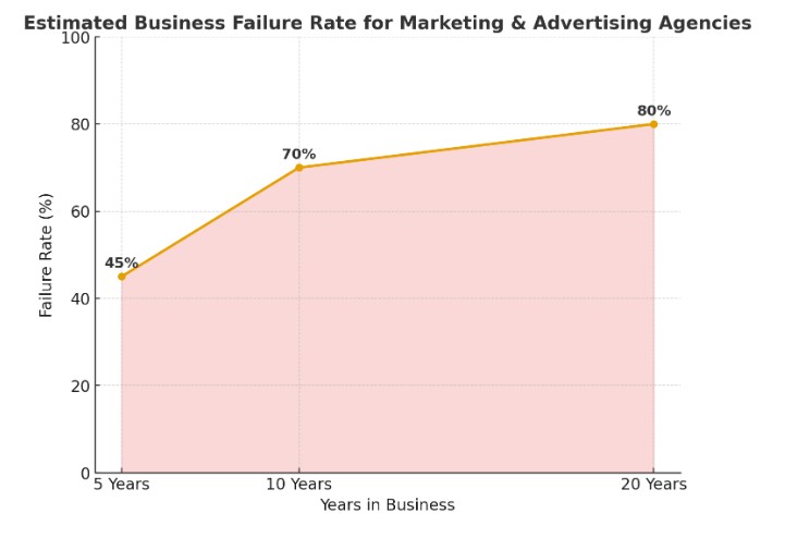 - According to studies, nearly 45% of marketing companies shut their doors within the first five years.